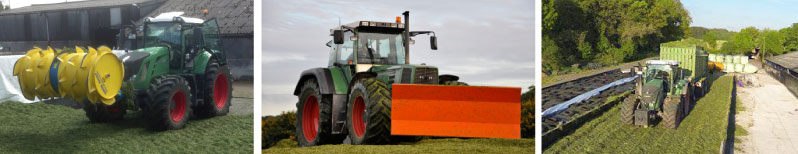 • Silo walzen mit einem Fendt 828 (Einsatzgewicht rund 13 Tonnen) • Bei der Grünfutterernte mit Reck Jumbo-Verteiler • Im Mais mit unserem eigens konzipierten hydraulisch klappbarem Schiebeschild